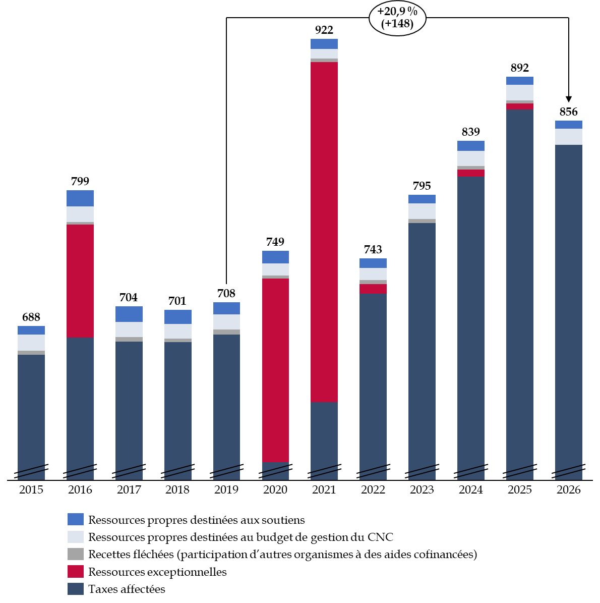 Le CNC ne bénéficie d'aucun crédit budgétaire mais son budget annuel est abondé par quatre taxes affectées. Les ressources du CNC sont en constante progression : entre 2015 et 2026, il devrait voir ses recettes augmenter de 25 %, soit 168 millions d'euros supplémentaires.