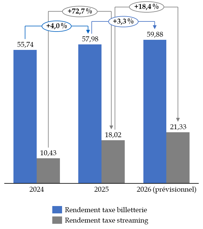 Le produit des taxes perçues par le CNC en 2026 est estimé à 785 millions d'euros, soit une hausse de 28,5 millions d'euros (+ 3,8 %) par rapport à 2025. La croissance de ces taxes découle de la dynamique du secteur, en particulier l'audiovisuel et les plateformes de streaming vidéo, et non d'un relèvement des taux, inchangés depuis 2019.