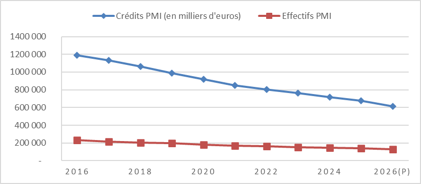 Les crédits des actions 02 et 03 diminuent, au total, de 100 millions d'euros en autorisations d'engagement et de 96,6 millions d'euros en crédits de paiement entre la LFI 2025 et le PLF 2026.