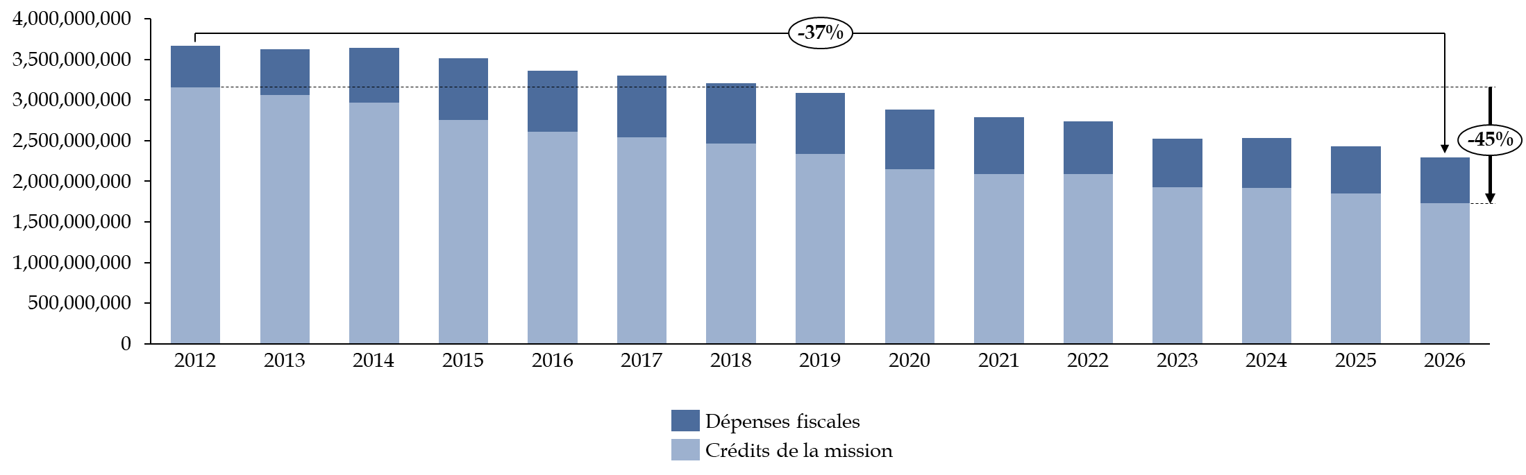Comme chaque année, ses crédits continuent de diminuer. L'année 2026 se démarque cependant par l'ampleur de la baisse : 120 millions d'euros entre 2025 et 2026, pour un budget qui s'établit désormais à 1,73 milliard d'euros. Il faut également considérer les dépenses fiscales rattachées à la mission, qui s'élèvent à 563 millions d'euros, dont 475 millions d'euros pour la demi-part fiscale attribuée aux titulaires de la carte du combattant et à leurs veuves de plus de 74 ans.