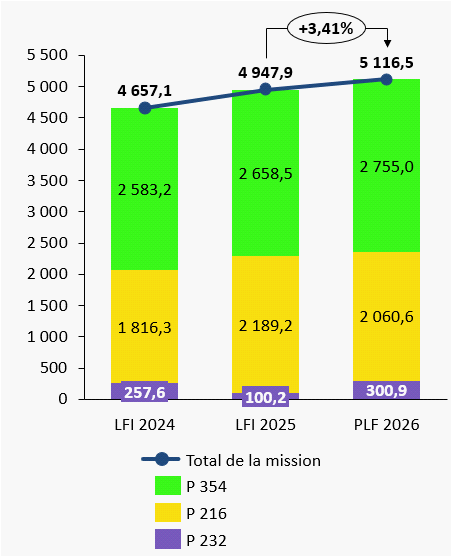 Le programme 354 « Administration territoriale de l'État » (ATE) constitue le programme phare de la mission. Représentant plus de la moitié des CP de celle-ci, il progresse de 3,63 % en 2026 par rapport à la LFI 2025.