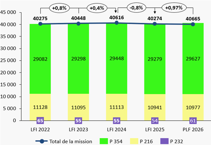 Le plafond d'emplois de la mission s'établit à 40 665 ETPT en 2026, soit une hausse de 0,97 % (391 ETP supplémentaires) par rapport à la LFI 2025.