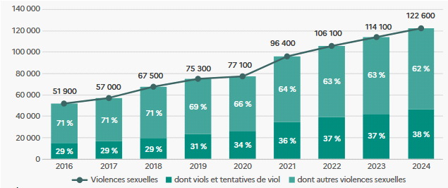 En 2024, les violences sexuelles enregistrées progressent nettement (+ 7 %), mais en léger ralentissement par rapport aux deux années précédentes, et par rapport à 2016 (hausse de 11 % par an en moyenne). Les viols et tentatives de viol enregistrés s'accroissent encore rapidement (+ 9 %). [...]