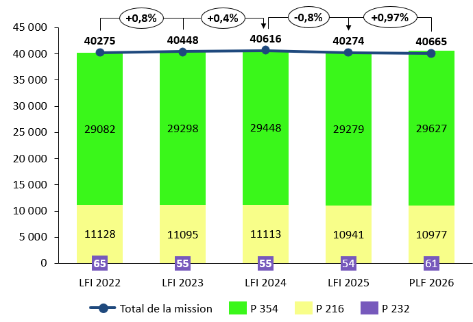 Le plafond d'emplois de la mission s'établit à 40 665 ETPT en 2026, soit une hausse de 0,97 % (391 ETP supplémentaires) par rapport à la LFI 2025.