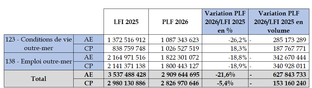 Les crédits de la mission « Outre-mer » présentés dans le projet de loi de finances pour 2026 s'élèvent à 2,91 milliards d'euros en AE et à 2,83 milliards d'euros en CP, soit une baisse de 21,6 % en AE et de 5,4 % en CP par rapport à la LFI 2025. En volume, la mission « Outre-mer » a perdu près de 628 millions d'euros en AE et près de 153 millions d'euros de CP.