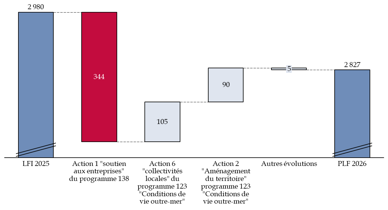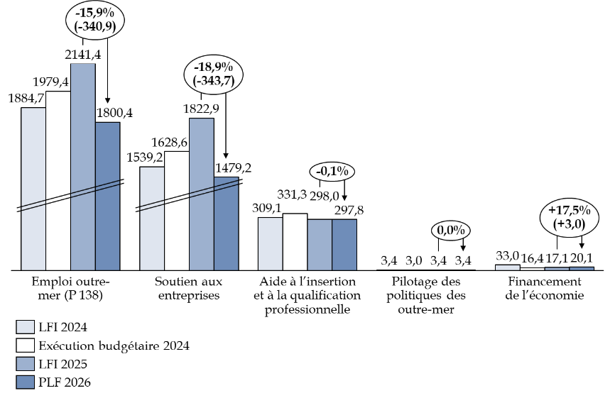Entre la LFI 2025 et le PLF 2026, le programme 138 représente 1,82 milliard d'euros en AE et 1,8 milliard d'euros en CP. Hors l'action 1 « Soutien aux entreprises », impactée par la réforme des exonérations LODEOM, les crédits de l'action 4 « Financement de l'économie » augmentent de 3 millions d'euros. Les prévisions de dépenses des autres actions demeurent stables.