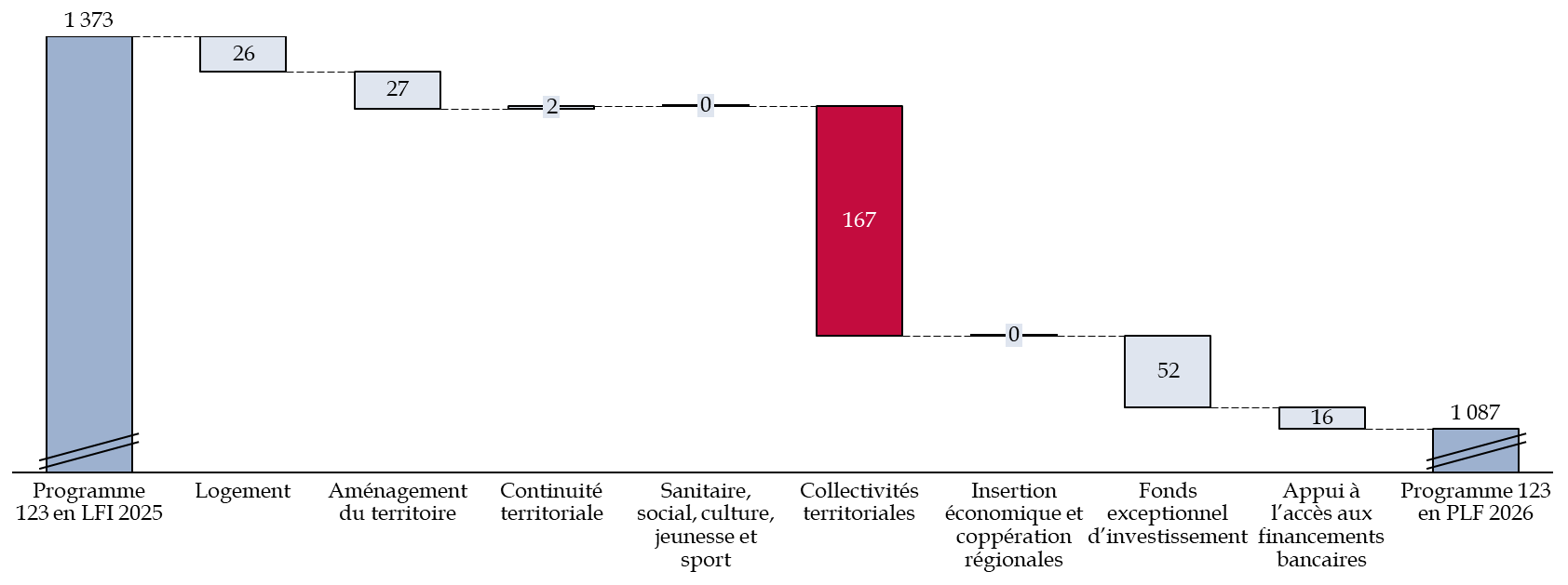 Le programme 123 « Conditions de vie outre-mer » rassemble les crédits des politiques publiques en faveur de l'amélioration des conditions de vie dans les outre-mer, concernant le logement social, l'aménagement du territoire (contrats de convergence et de transformation), les aides à la continuité territoriale, les dotations spéciales destinées à financer des projets structurants et le fonds exceptionnel d'investissement. Le programme 123 représente 1 087 millions d'euros en AE et 1 026 millions d'euros en CP au PLF 2026.