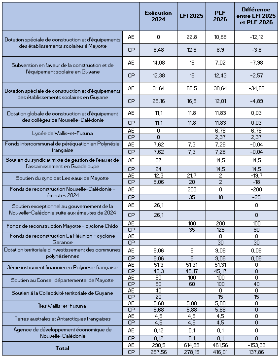 - ce sont 200 millions d'euros en AE et 125 millions d'euros en CP qui sont programmés pour la reconstruction de Mayotte, contre 100 millions en AE et 35 millions en CP en 2025. La dotation du conseil départemental de Mayotte est de plus maintenue à hauteur de 100 millions d'euros ;