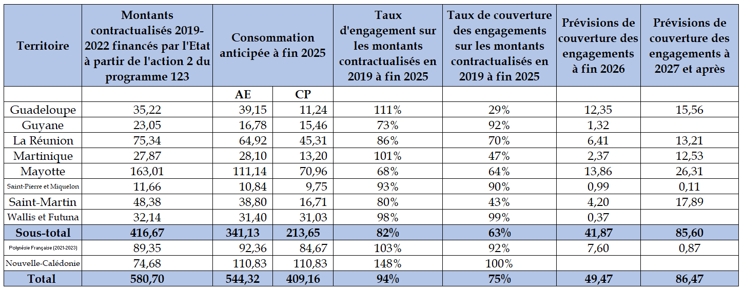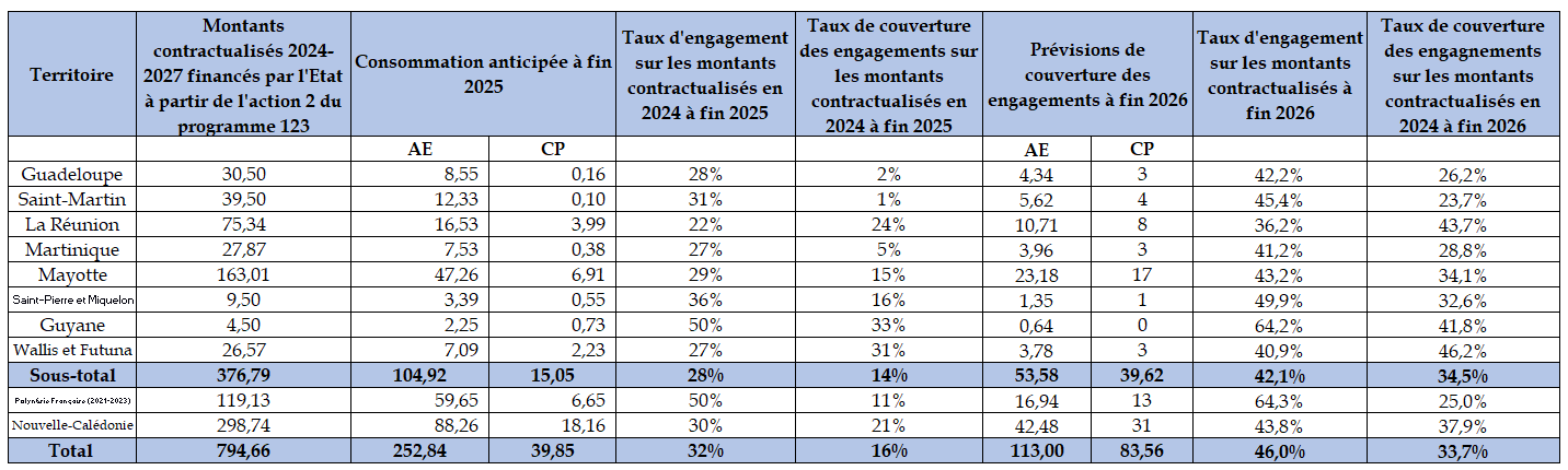 Or il est frappant de constater que l'intégralité des montants contractualisés entre 2019 et 2023 n'ont pu être intégralement engagés. Ainsi, au total, le taux d'engagement sur les montants contractualisés fin 2025 est de 94 %, et de 82 % en excluant les engagements relatifs à la Polynésie française et à la Nouvelle-Calédonie. Le taux de couverture des engagements sur les montants contractualisés n'est que de 75 % en 2025. En 2026, ce sont 49,5 millions d'euros en crédits de paiement qui seront consommés au titre des engagements pris dans le cadre des CCT de première génération (2019-2023).