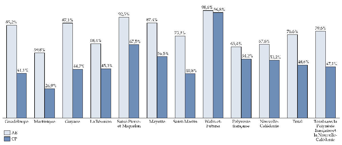 En particulier, à Mayotte, seuls 64 % des montants contractualisés ont été engagés ; en Guyane la proportion n'est que de 73 % et à La Réunion ce sont 86 % des montants contractualisés qui ont pu être engagés seulement. Par ailleurs, le taux de couverture des engagements est particulièrement faible en Guadeloupe (à hauteur de 29 %), en Martinique (47 %) et à Saint-Martin (43 %).