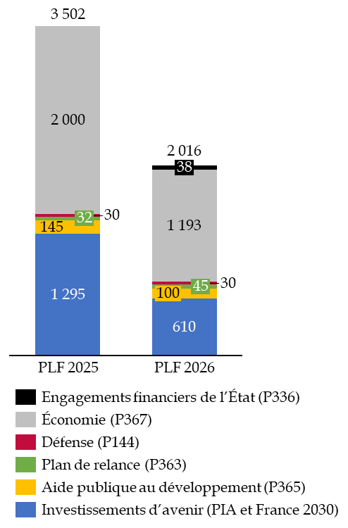 Pour l'exercice 2026, les recettes budgétaires ont par conséquent uniquement pour objet de financer des interventions en fonds propres de l'État. Dans le cadre de ces interventions, la réduction des crédits du compte spécial résulte également du ralentissement des versements au profit du compte spécial en provenance de la mission « Investir pour la France de 2030 », ces versements étant réduits de 53 % entre les exercices 2025 et 2026.