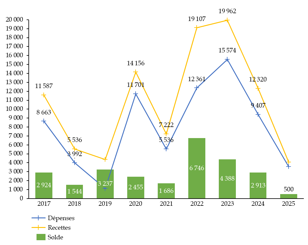 Note : Le solde indiqué correspond au solde à la fin de chaque exercice. Les données pour 2025 sont prévisionnelles.