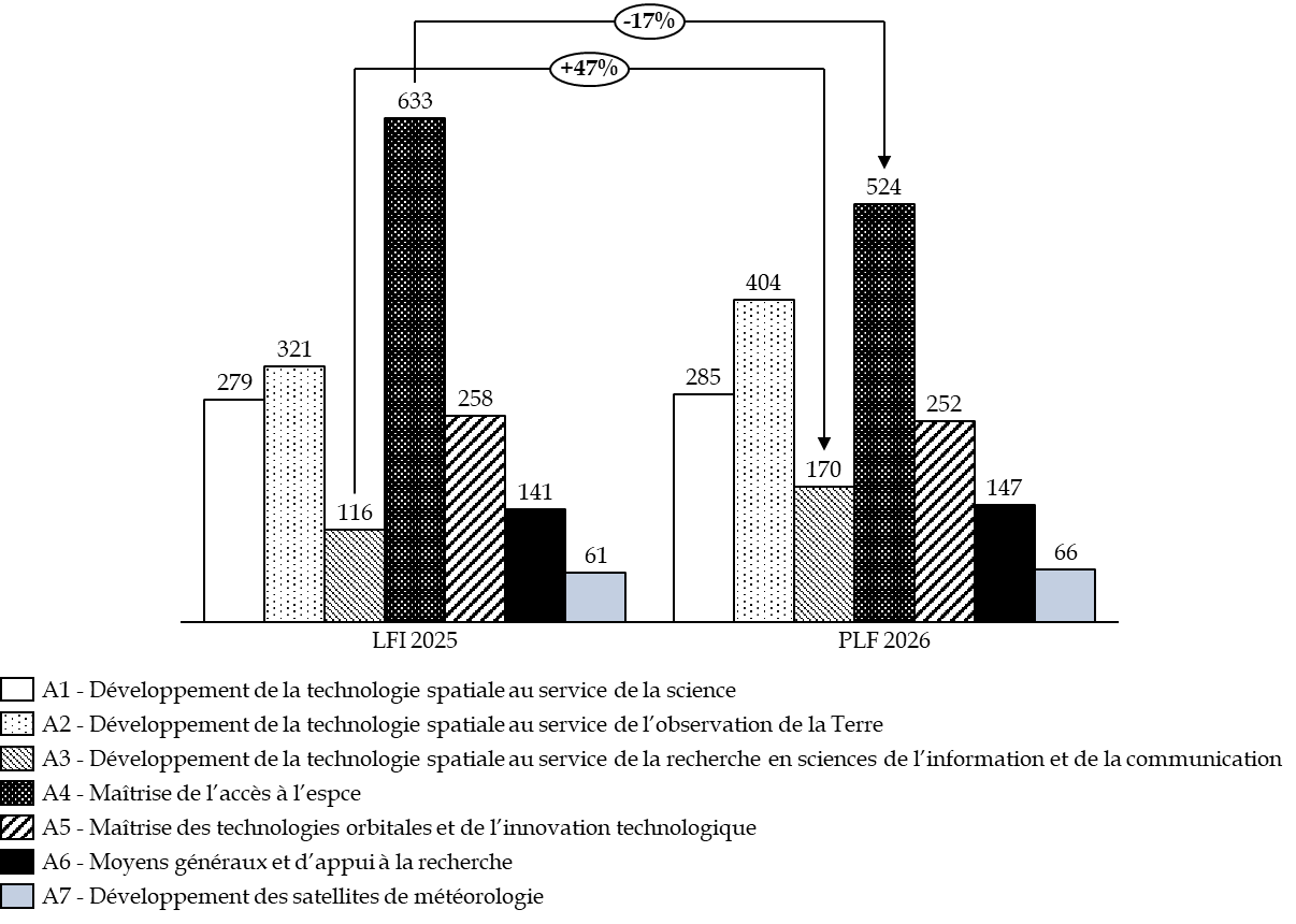 Le programme 193 « Recherche spatiale » sert de support au financement de la politique spatiale nationale et à la participation de la France à la politique spatiale européenne, les crédits transférés à l'Agence spatiale européenne (ESA38(*)) représentant un montant proposé de 1 090 millions d'euros de crédits de paiement (CP) en 2026, soit 59 % de l'ensemble des crédits proposés pour le programme.