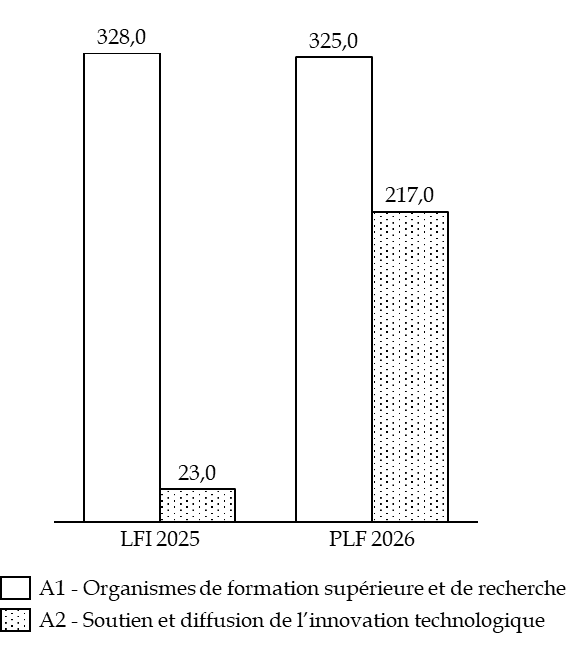 Parallèlement, le rapporteur spécial relève que la stabilisation des crédits de l'action n° 1 « Organismes de formation supérieure et de recherche » correspond à la stabilisation des crédits du programme affectés aux opérateurs en 2026 et notamment à la stabilité de la subvention versée au groupe « Mines Télécom » (GMT) qui atteint 289 millions d'euros en crédits de paiement (CP) pour 2026.