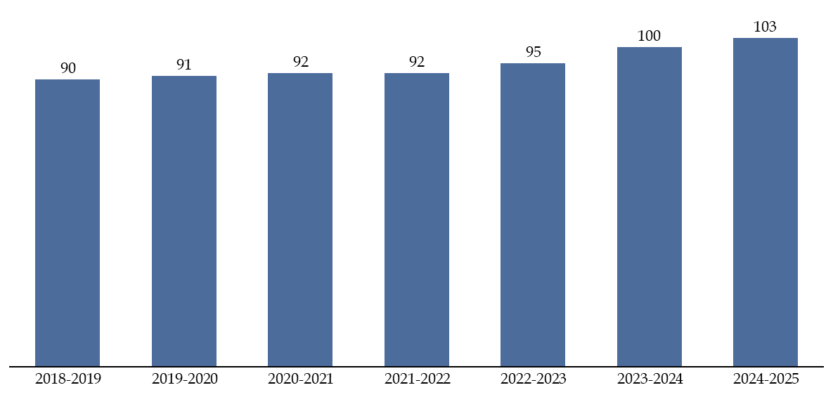 L'article L. 841-5 du code de l'éducation prévoit que la CVEC est indexée sur l'inflation. En conséquence, son montant, et donc son rendement, ont particulièrement augmenté au cours des deux dernières années et plus spécifiquement à la rentrée 2023. La CVEC a ainsi franchi l'année précédente la barre des 100 euros par étudiant, contre 90 euros lors de sa création en 2018. Elle s'élève à 103 euros par étudiant en 2025.