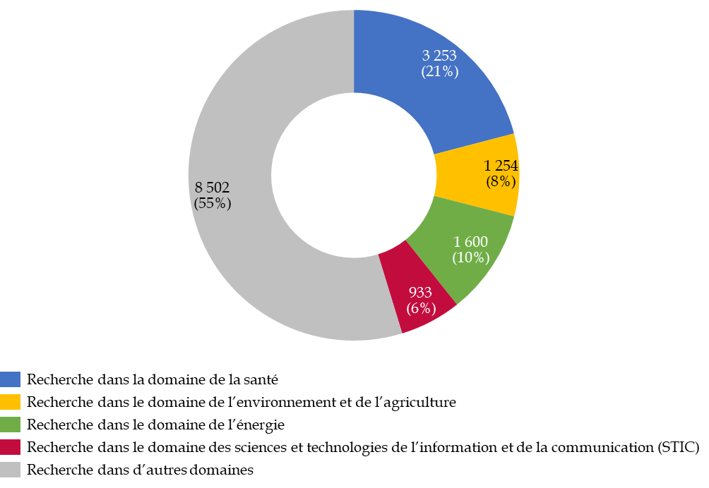 La recherche publique finance en priorité les domaines de recherche qui correspondent aux principaux défis scientifiques auxquels la société est affrontée dont notamment les transitions en cours dans le domaine de la santé, du numérique, de l'environnement et de l'énergie. Les crédits dédiés à la recherche publique dans ces quatre domaines atteint 7 milliards d'euros en 2025, soit 45 % du montant total des crédits « recherche » de la mission.