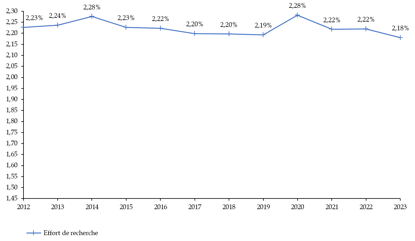 Note : L'effort de recherche correspond aux dépenses intérieures de recherche et développement (DIRD) rapporté au produit intérieur brut (PIB).