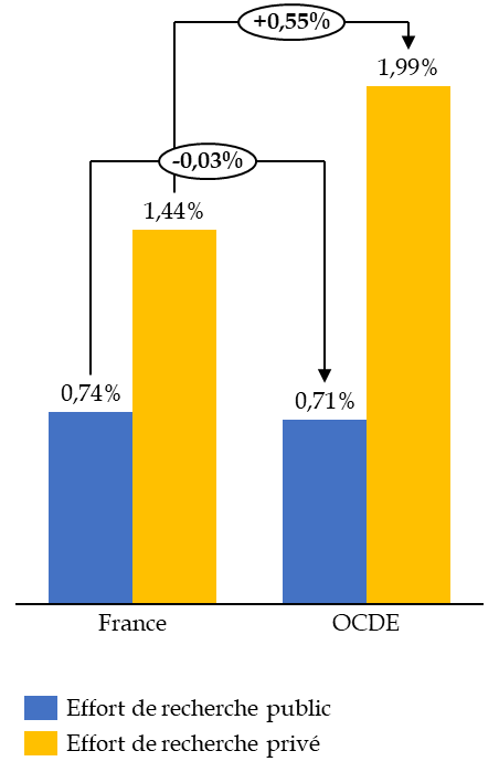 Par suite, le retard de la France vis-à-vis de la moyenne de l'OCDE est expliqué intégralement par le déficit d'investissement privé dans la recherche et développement.