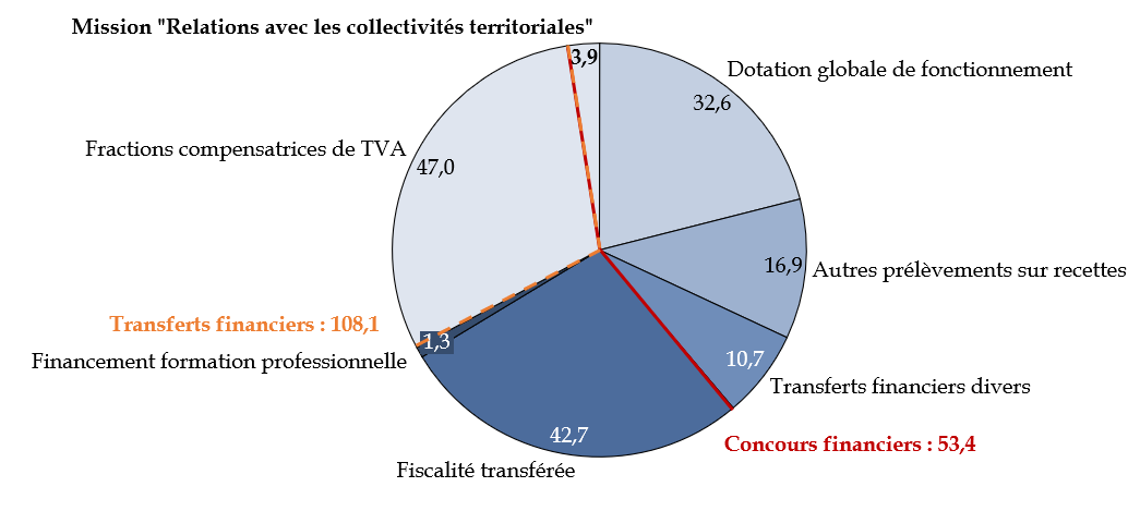 Au sens élargi, les transferts financiers comprennent aussi les fractions de TVA attribuées au titre des réformes récentes de la fiscalité locale (suppression ou réaffectation de la taxe d'habitation sur les résidences principales, de la taxe foncière sur les propriétés bâties et de la cotisation sur la valeur ajoutée des entreprises) pour 47,0 milliards d'euros.