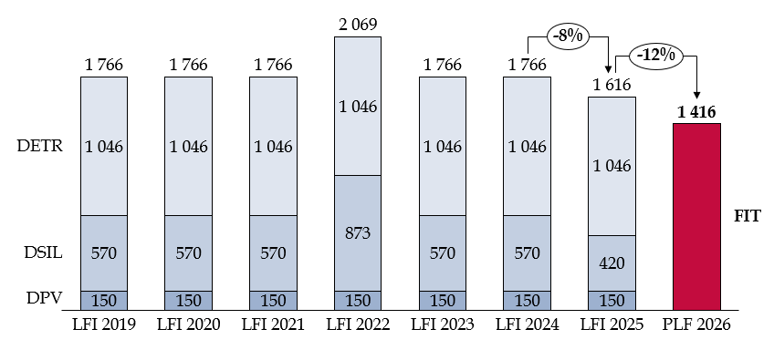 Sur le plan budgétaire, le FIT ne se fait pas à budget constant. Après une longue période de stabilité des dotations d'investissement en faveur du bloc communal, la baisse de 200 millions d'euros en AE proposée par ce PLF 2026 avec la création du FIT vient s'ajouter à une première baisse concédée dans le cadre de l'examen de la loi de finances pour 2025.