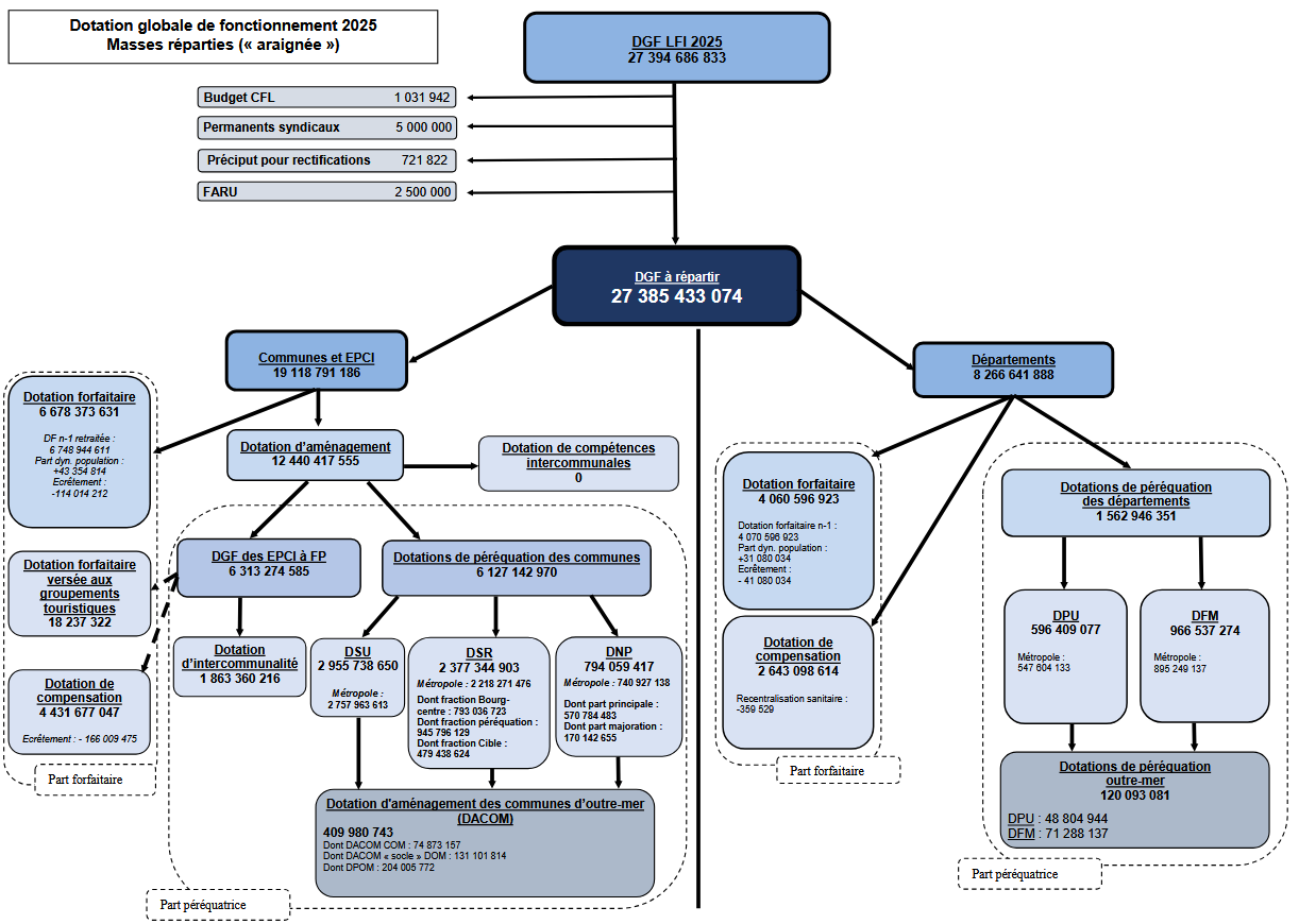 Les dotations de péréquation verticale des communes et des départements sont des composantes de leur dotation globale de fonctionnement (DGF). En loi de finances initiale (LFI) pour 202550(*), le montant total de la DGF s'élevait à 27,4 milliards d'euros.