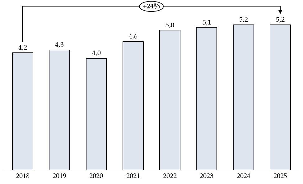Cette fraction, dite « TVA-DGF », représente environ 5,2 milliards d'euros en 2024. Ce montant est « gelé » pour 2025 en application de l'article 109 de la loi de finances pour 202564(*).