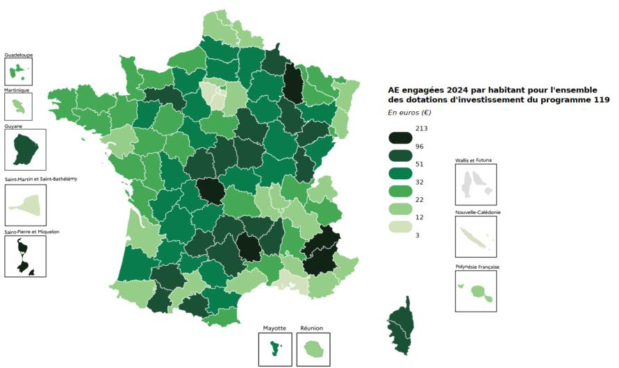 - la dotation de péréquation urbaine (DPU) pour les départements urbains, répartie selon des critères de richesse fiscale et de revenu moyen par habitant. En 2025, le montant de DPU réparti s'élevait à 596 millions d'euros ;