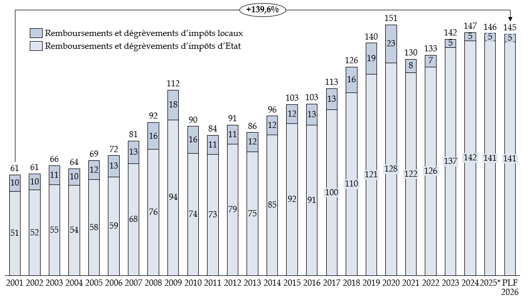En PLF 2026, les crédits évalués de la mission « Remboursements et dégrèvements » s'élèvent à 145,4 milliards d'euros, connaissant une légère baisse par rapport à la loi de finances initiale pour 2025 (- 1,9 %) et par rapport à la dernière estimation à date cette année-là (- 0,4 %).