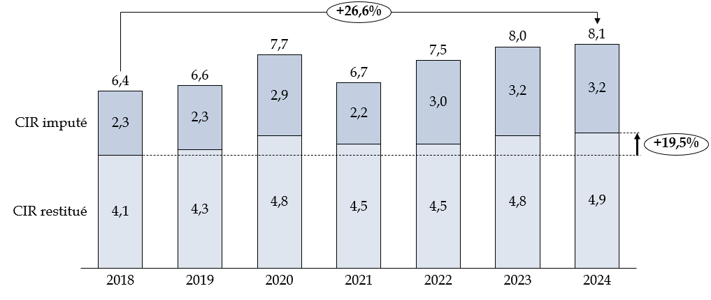 Note : les données représentées concernent le crédit d'impôt recherche et le crédit d'impôt innovation, dont il n'est pas possible de distinguer les parts respectivement restituée et imputée.
