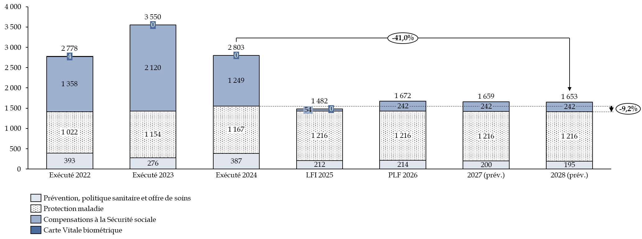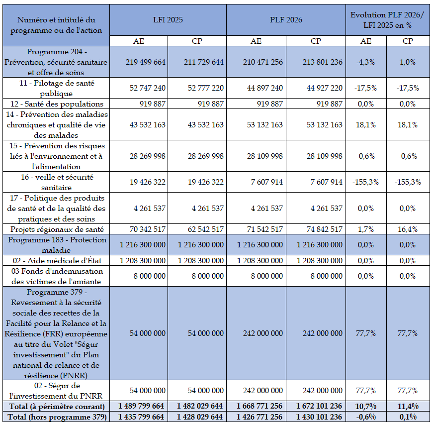 En 2026, le programme 204 représente 13 % des dépenses de la mission et le programme 379 correspond à 14,5 % des dépenses, le reliquat étant consacré au programme 183 « Protection maladie ».
