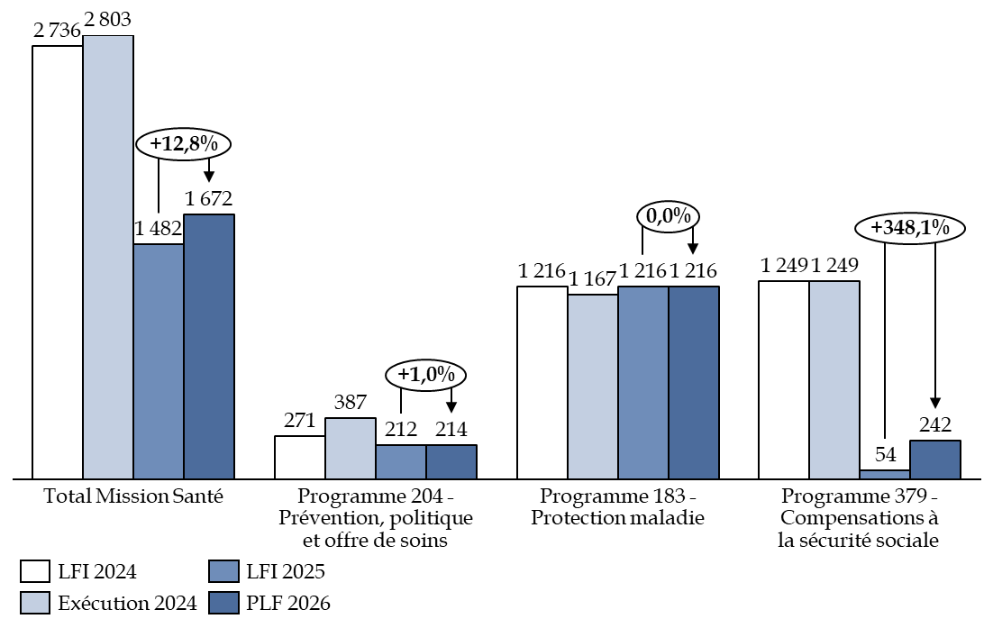 La mission « Santé » représente, en loi de finances initiale (LFI) pour 2026, 1 668,8 millions d'euros en AE et 1 672 millions d'euros en CP, soit une hausse de 10,7 % en AE et de 11 % en CP, représentant 179 millions d'euros en AE et 190,1 millions d'euros en CP.