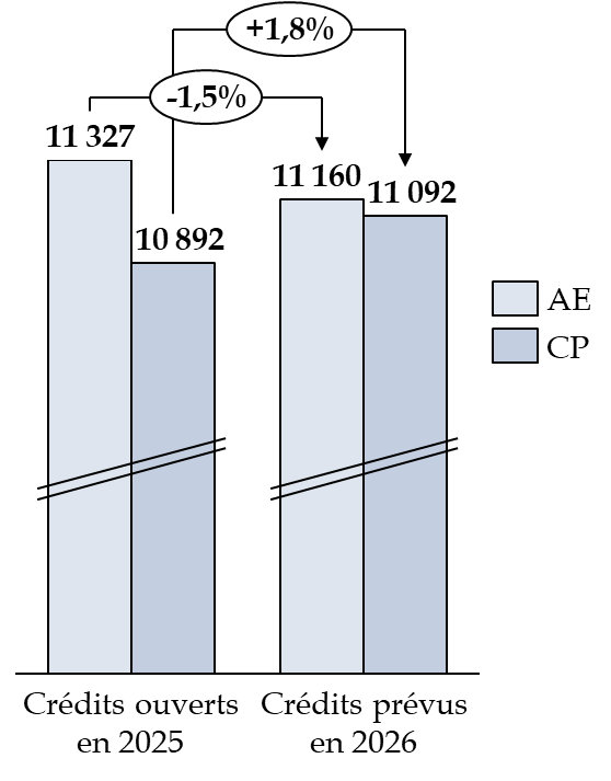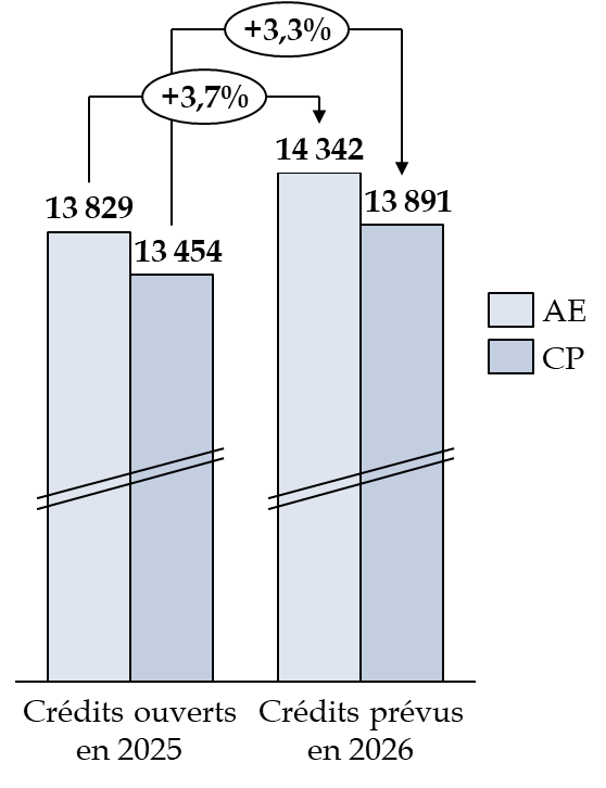 En 2026, les crédits cumulés de la police et de la gendarmerie nationales progressent par rapport à 2025, tant en AE (+ 1,4 %, soit + 346 millions d'euros) qu'en CP (+ 2,6 %, soit + 637 millions d'euros). Cette évolution, intervenue dans un contexte de forte contrainte budgétaire, doit être saluée. Les crédits atteignent 25,5 milliards d'euros en AE et 25,0 milliards d'euros en CP.