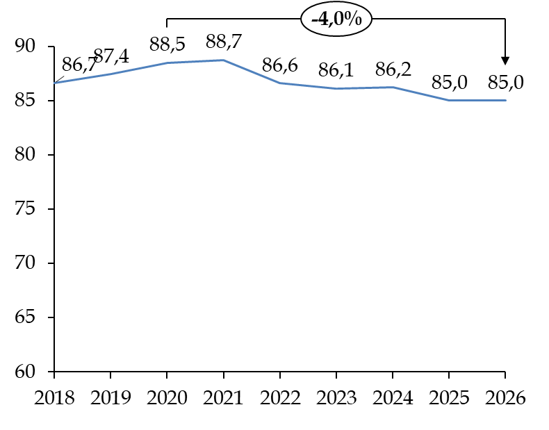 En 2026, la part des crédits de titre 2 dans les deux programmes demeure globalement stable, représentant 85 % des crédits en CP (87 % pour la police nationale et 82,5 % pour la gendarmerie nationale).