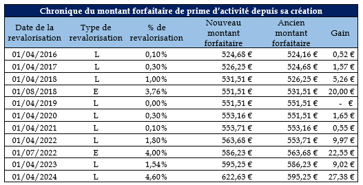 La prime d'activité, créée par la loi n° 2015-994 du 17 août 2015 relative au dialogue social et à l'emploi, a remplacé au 1er janvier 2016 la part « activité » du revenu de solidarité active (RSA) ainsi que la prime pour l'emploi (PPE). Cette prime est versée aux personnes en activité professionnelle dont les ressources sont inférieures à un certain montant garanti. Son montant est revalorisé automatiquement au 1er avril de chaque année en application de l'article L. 161-25 du code de la sécurité sociale.