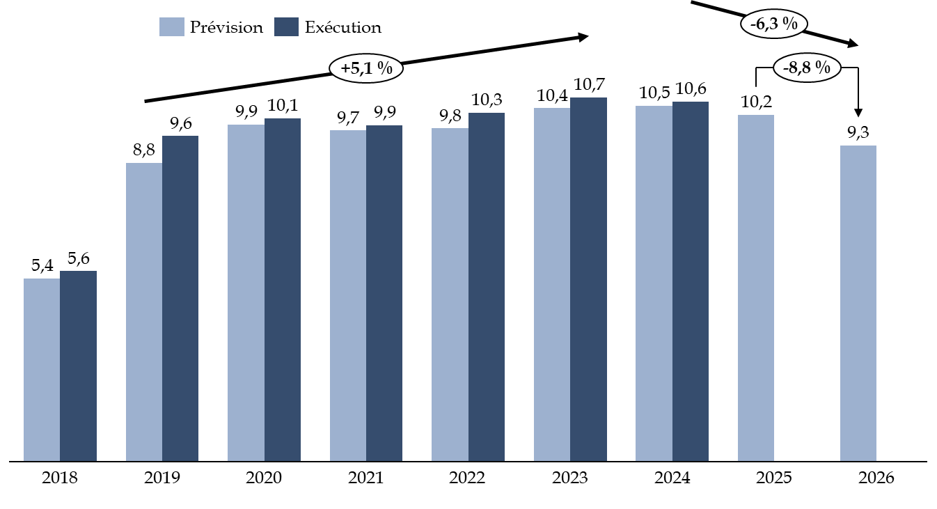En PLF pour 2026, 9,3 milliards d'euros en AE et CP sont prévus au titre de ce dispositif, soit une baisse de seulement 8,8 % par rapport à la LFI pour 2025.