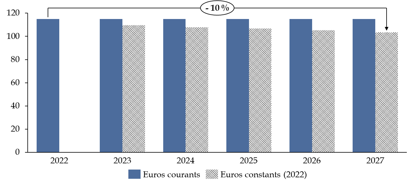 En termes réels, la dotation annuelle diminuerait donc de 10 % à l'horizon 2027 d'après les hypothèses d'inflation figurant au rapport économique, social et financier (RESF) annexé au présent projet de loi de finances, réduisant donc d'autant les quantités de denrées pouvant être achetées. Les associations entendues par les rapporteurs spéciaux ont ainsi indiqué que la diminution en termes réels des fonds européens était l'une des causes de leurs difficultés.