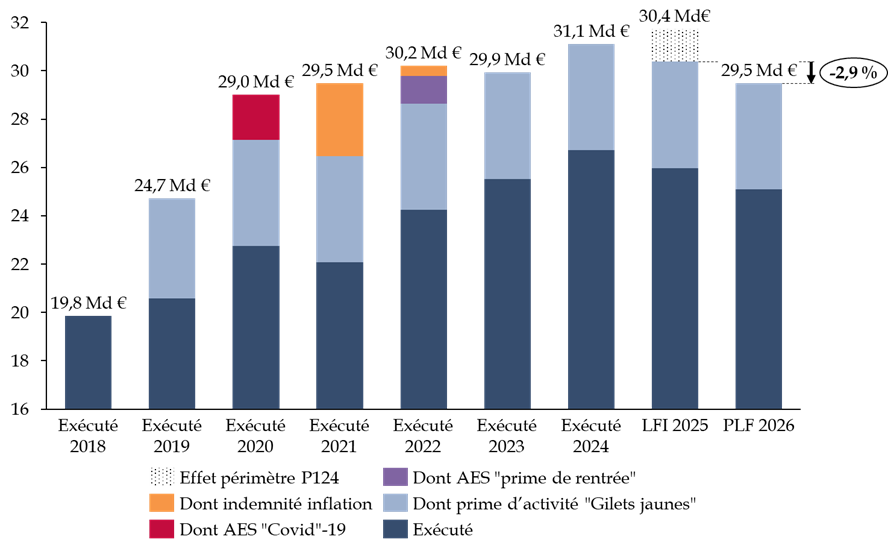 Cette diminution des dépenses s'explique par une forte baisse des dépenses de prime d'activité (- 8,8 %), principalement du fait de mesures paramétriques prises en 2025 et à venir en 2026, ce qui compense largement le dynamisme plus maîtrisé de l'AAH (+ 1,7 %). Le principe de « l'année blanche », prévu par l'article 44 du projet de loi de financement de la sécurité sociale (PLFSS) pour 2026, induit également une stabilisation des dépenses par une neutralisation de « l'effet prix ».