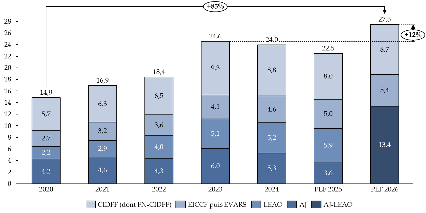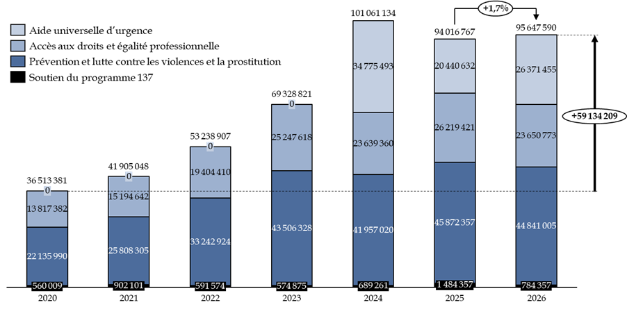 Les crédits demandés au titre de la mission « Solidarité, insertion et égalité des chances » pour 2026 s'élèvent à 29,5 milliards d'euros en autorisations d'engagement (AE) et en crédits de paiement (CP). Plus des trois quarts de ce total est consacré respectivement au financement de la prime d'activité (9,3 milliards d'euros) et de l'AAH (14,6 milliards d'euros).