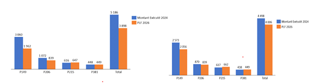 * 7 Le décret n° 2024-124 du 21 février 2024 portant annulation de crédits a abouti à l'annulation, en AE comme en CP de 60 011 065 euros sur le programme 215 et de 10 512 570 euros sur le programme 206.