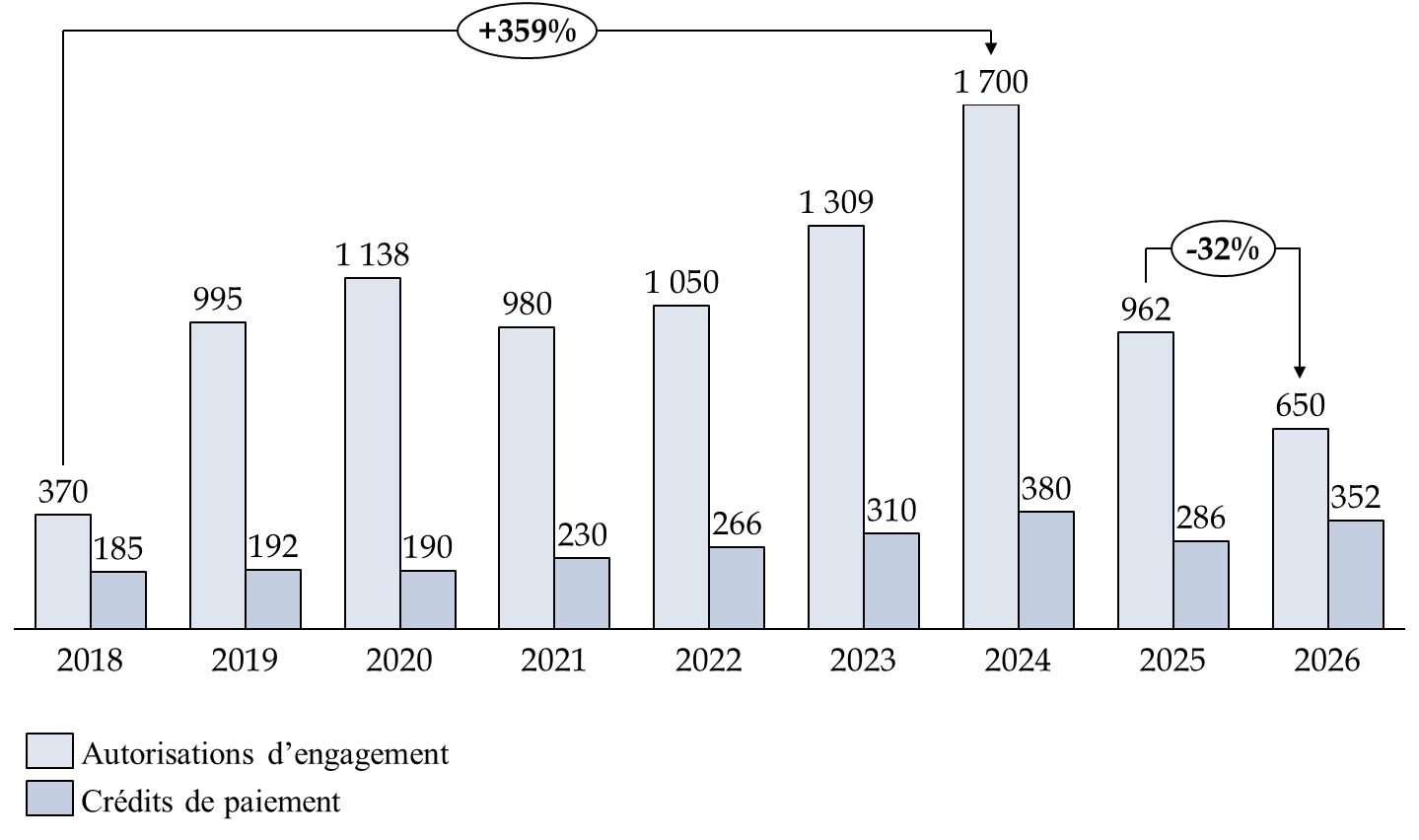 Pour 2026, 14,7 millions d'euros d'autorisations d'engagement et 93,4 millions d'euros de crédits de paiement sont demandés. Les crédits ouverts devraient se répartir entre :