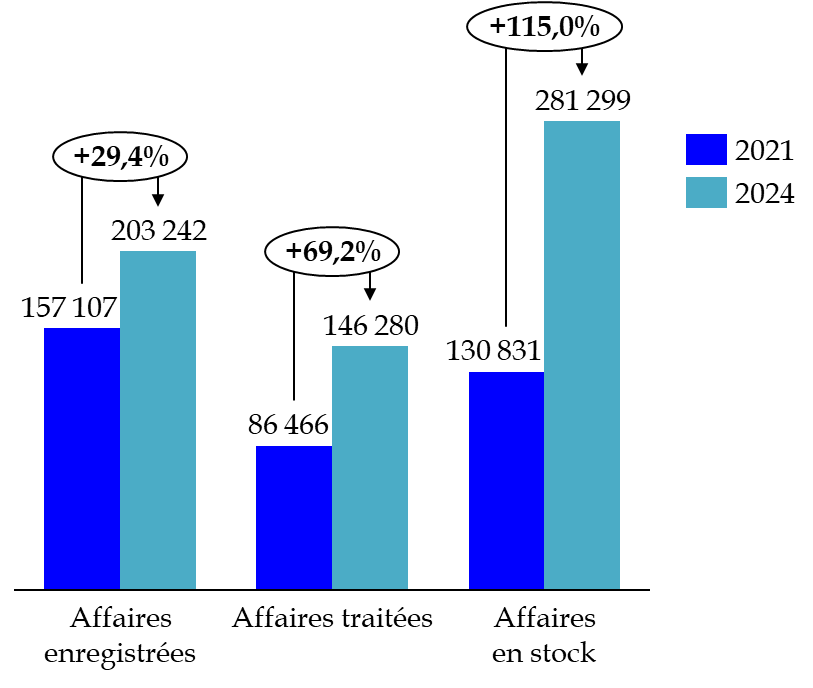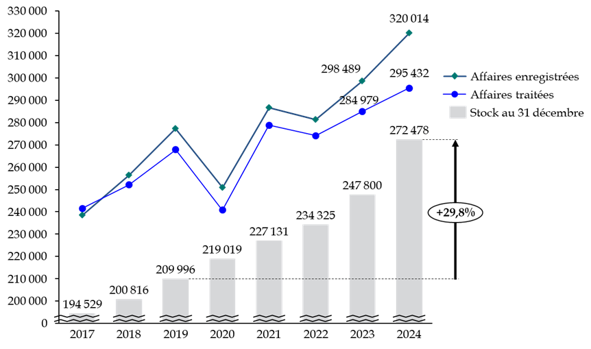 Par ailleurs, le rapporteur spécial attire l'attention de la commission sur le risque d'engorgement du Tribunal du stationnement payant (TSP). En effet, cette juridiction spécialisée, dont la gestion a été transférée au programme 165 depuis 2024, a vu son activité presque tripler entre sa création en 2018 et 2024, mais n'a pas vu ses effectifs augmenter en conséquence sur cette période.
