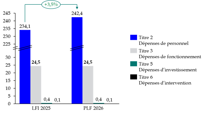 La mission bénéficierait en 2026 de 869,3 millions d'euros en crédits de paiement (CP), soit une baisse de 2,6 % par rapport à la loi de finances initiale (LFI) pour 2025. Les dépenses de personnel représentent plus de 84 % des crédits demandés pour la mission.