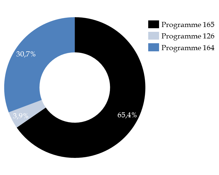 L'ampleur budgétaire de ces programmes demeure inégale, en faveur du programme 165 « Conseil d'État et autres juridictions administratives », qui concentre à lui seul près de deux tiers des crédits de la mission. Les crédits demandés se répartissent comme suit :