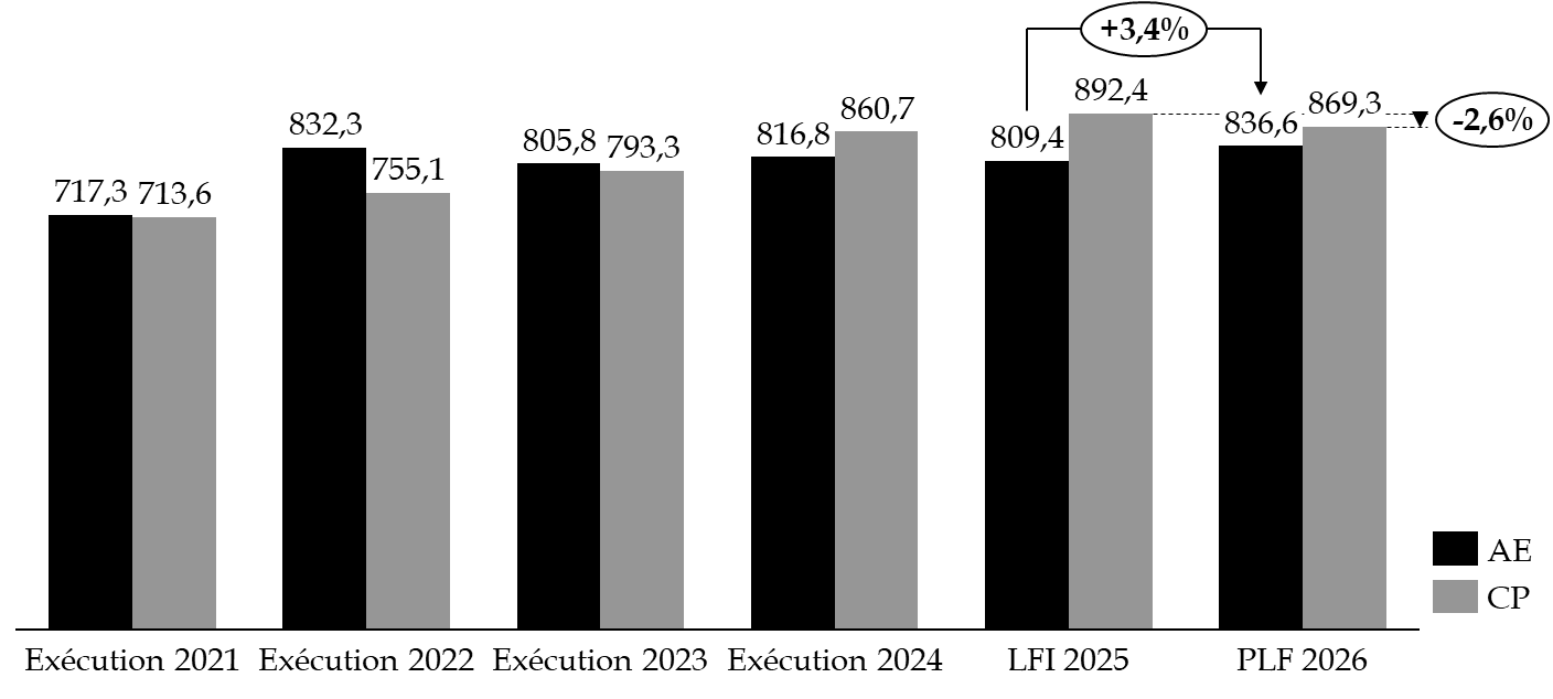 La mission bénéficierait en 2026 de 836,6 millions d'euros en AE et de 869,3 millions d'euros en CP. Les moyens alloués diminuent cette année de 2,6 % s'agissant des CP. Les AE sont quant à elles en hausse de 3,4 %.