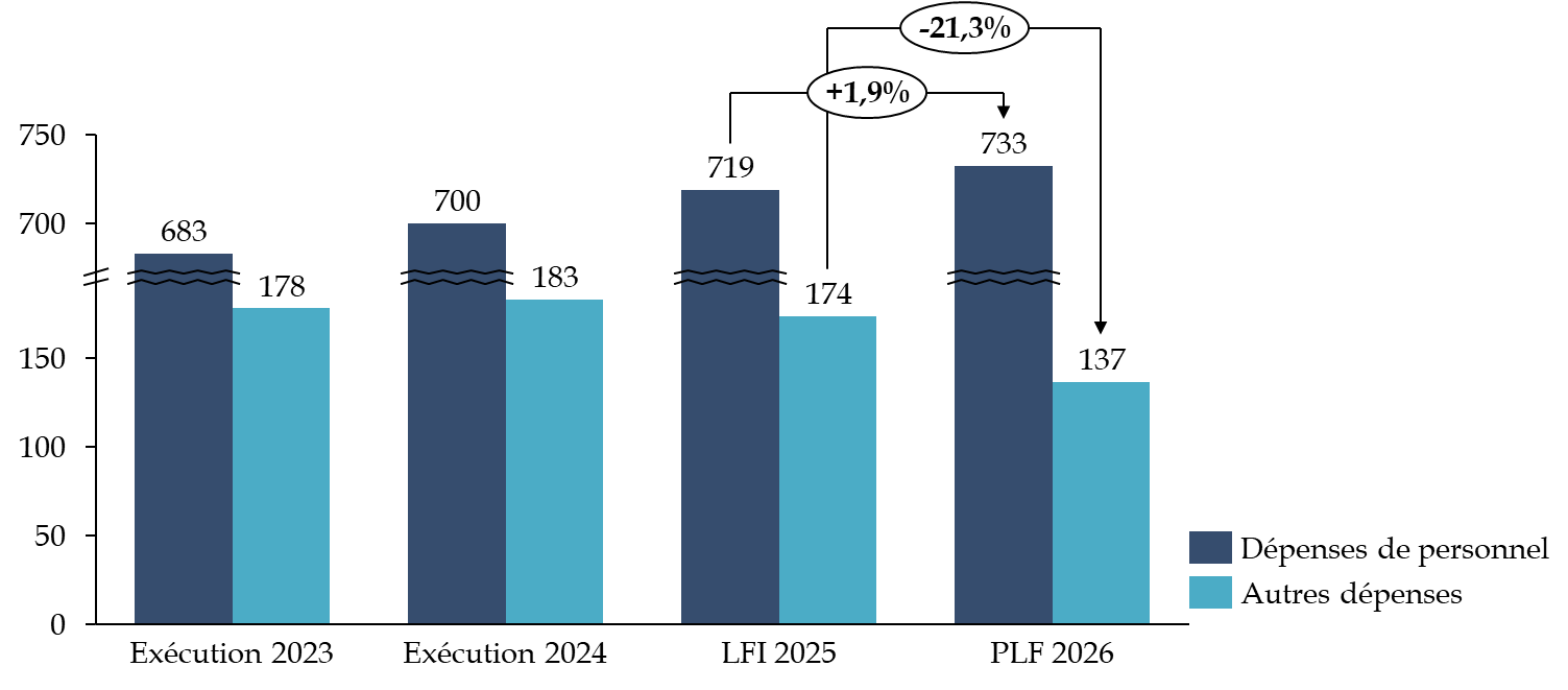 Les dépenses de personnel représentent 84,2 % des crédits de la mission. Elles feraient l'objet d'une hausse de près de 2 % en 2026. Cette hausse est portée par les programmes 164 (+ 3,4 %) et 165 (+ 1,2 %).