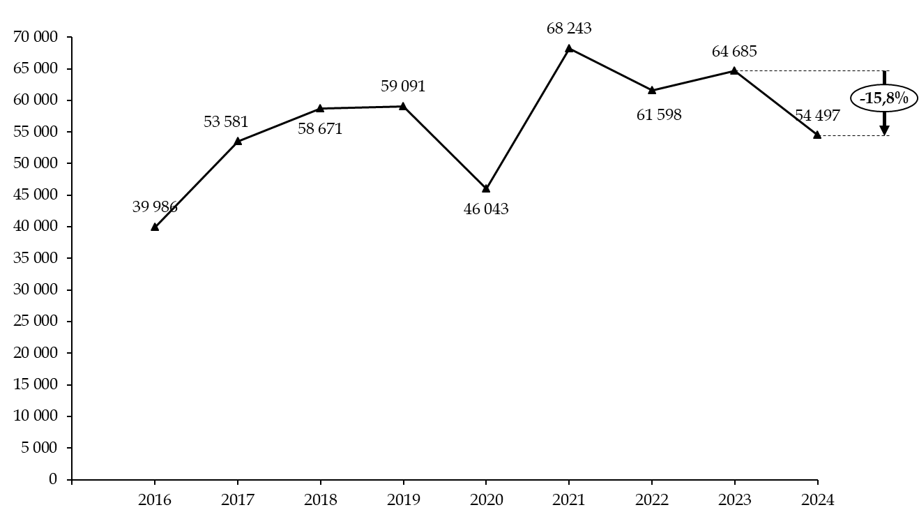 En ce qui concerne la CNDA, l'augmentation du nombre d'affaires entrantes s'inscrit elle aussi dans une tendance durable depuis 2008. La Cour a ainsi triplé sa capacité de jugement en 10 ans, période pendant laquelle les affaires entrantes ont crû de 115 %. En effet, la CNDA est confrontée, année après année, à une hausse soutenue du contentieux de l'asile : de 2009 à 2019, la progression du contentieux s'est élevée à près de 140 %. Après une année 2020 marquée par le confinement lié à la crise sanitaire et une évolution des entrées non significative (- 37 %), celles-ci ont continué de progresser jusqu'en en 2023 (+ 9,5 % par rapport à 2019). Toutefois, l'année 2024 marque un recul notable du nombre de saisines par rapport à l'année précédente (- 15,8 %).