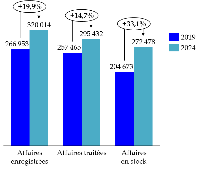 À partir de 2021, la baisse conjoncturelle des entrées liée à la crise sanitaire s'est progressivement résorbée. De 2020 à 2023, le nombre d'affaires enregistrées en cumulé devant les tribunaux administratifs et les cours administratives d'appel a augmenté de 15 %, passant de 250 766 à 288 915 affaires.
