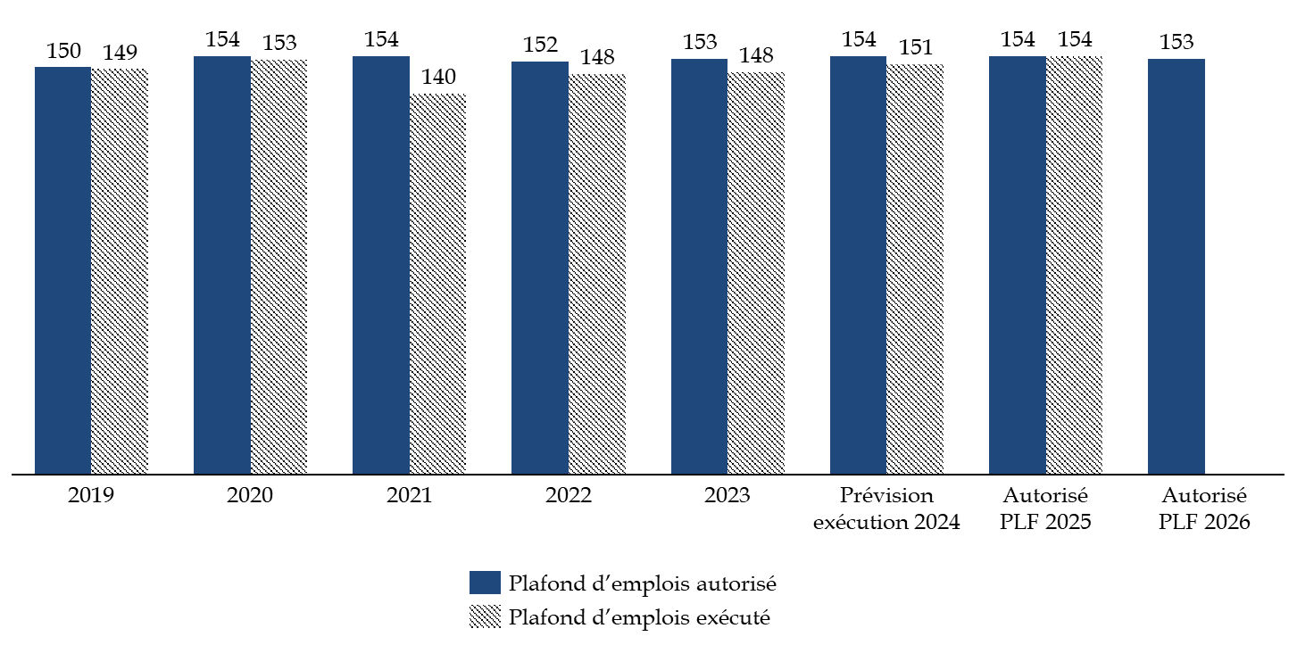 Les dépenses de personnel du programme 126 s'élèvent à 27,8 millions d'euros en 2026, et sont également stables. Elles représentent presque 80 % du budget total alloué au CESE et comprennent, d'une part, les rémunérations des membres (8,4 millions d'euros), et d'autre part, les rémunérations des personnels (15,5 millions d'euros). Le plafond d'emplois du CESE a été ramené à 154 ETPT cette année (- 1 ETP par rapport à la LFI 2025). Le rapporteur spécial a, à plusieurs reprises, alerté la commission des finances sur la sous-exécution du plafond d'emplois. Après cinq années consécutives de sous-exécution, celui-ci devrait toutefois être exécuté en 2025 à un niveau très proche de la prévision.