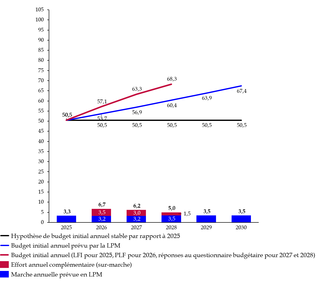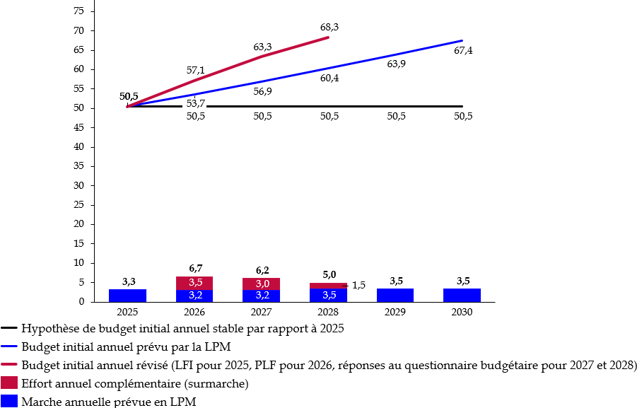 Dans ce contexte, le président de la République a annoncé le 13 juillet 2025 une accélération de l'effort budgétaire en faveur des armées pour 2026 et 2027. Aux marches annuelles de 3,2 milliards d'euros prévues par la LPM en 2026 et 2027, doivent ainsi s'ajouter des surmarches représentant « un effort de 3,5 milliards d'euros en 2026 et de 3 milliards d'euros supplémentaires l'année suivante ». Les documents budgétaires annexés au budget pour 2026 laissent quant à eux entrevoir une surmarche d'environ 1,5 milliard d'euros en 2028.