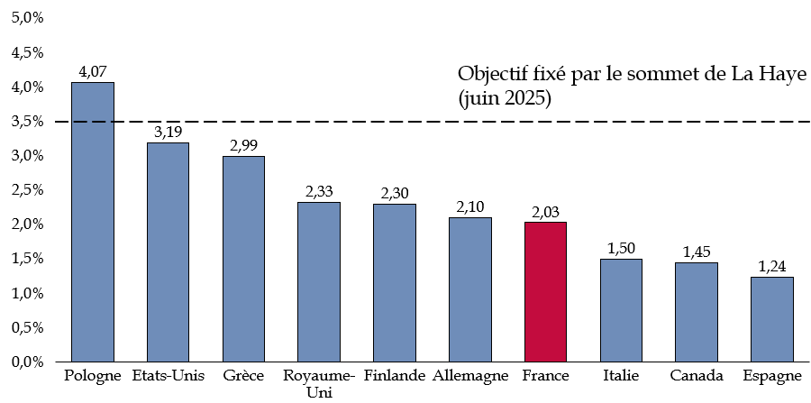Dans un environnement stratégique très dégradé, la France et ses alliés ont depuis engagé, en 2025, une réévaluation de leurs doctrines et de leurs engagements stratégiques, y compris budgétaire. Deux événements ont marqué cette inflexion : d'une part, en France, la publication, en juillet 2025, d'une Revue nationale stratégique (RNS) actualisée, qui constate l'entrée dans une ère stratégique nouvelle, caractérisée par un risque accru de guerre de haute intensité sur le continent ; d'autre part, le sommet de l'OTAN de La Haye (juin 2025), au cours duquel les Alliés ont décidé de porter leur objectif de dépenses militaires de 2 % à 3,5 % du PIB d'ici 2035.